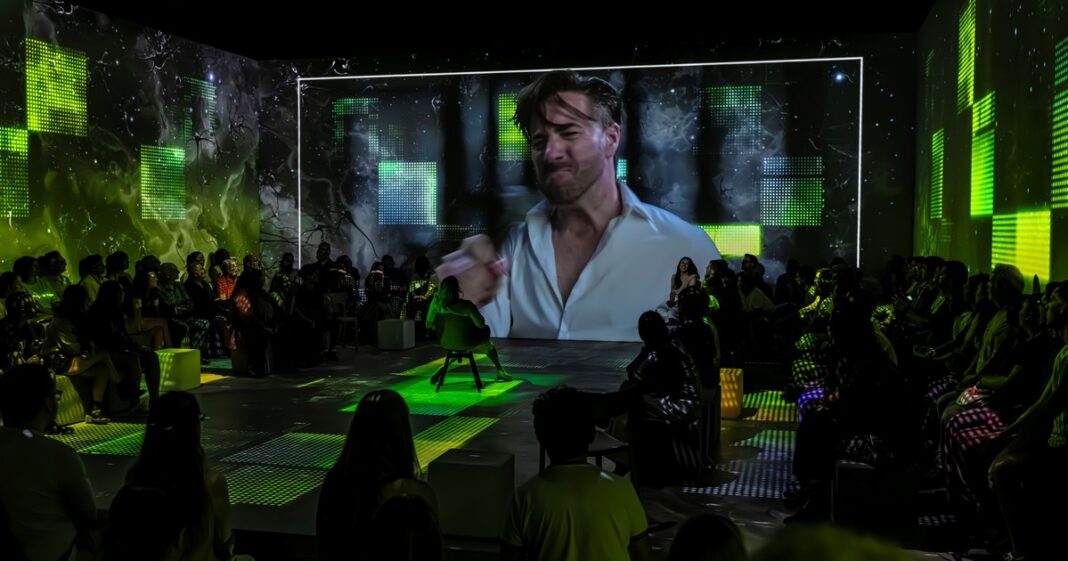 La versión inmersiva que desde el viernes está en el mismo espacio que cuando se estrenó en septiembre, pero con dos los intérpretes de Broadway y hablada en inglés, cuenta con el mismo dispositivo en 270º, con proyecciones en tres de las paredes y en el piso, y los espectadores sentados en puffs sin respaldo, algunos contra las paredes, otros más cercanos.