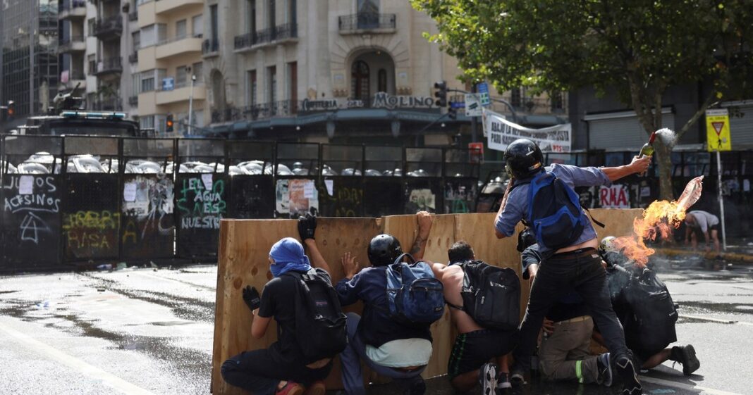 La situación empeoró media hora más tarde. Luego de que se registraron los primeros incidentes entre las columnas de partidos de izquierda – MST, Partido Obrero, PTS, y los efectivos de seguridad, los manifestantes que se ubicaron hasta ese momento sobre la avenida Rivadavia comenzaron a replegarse hacia la calle Hipólito Yrigoyen.