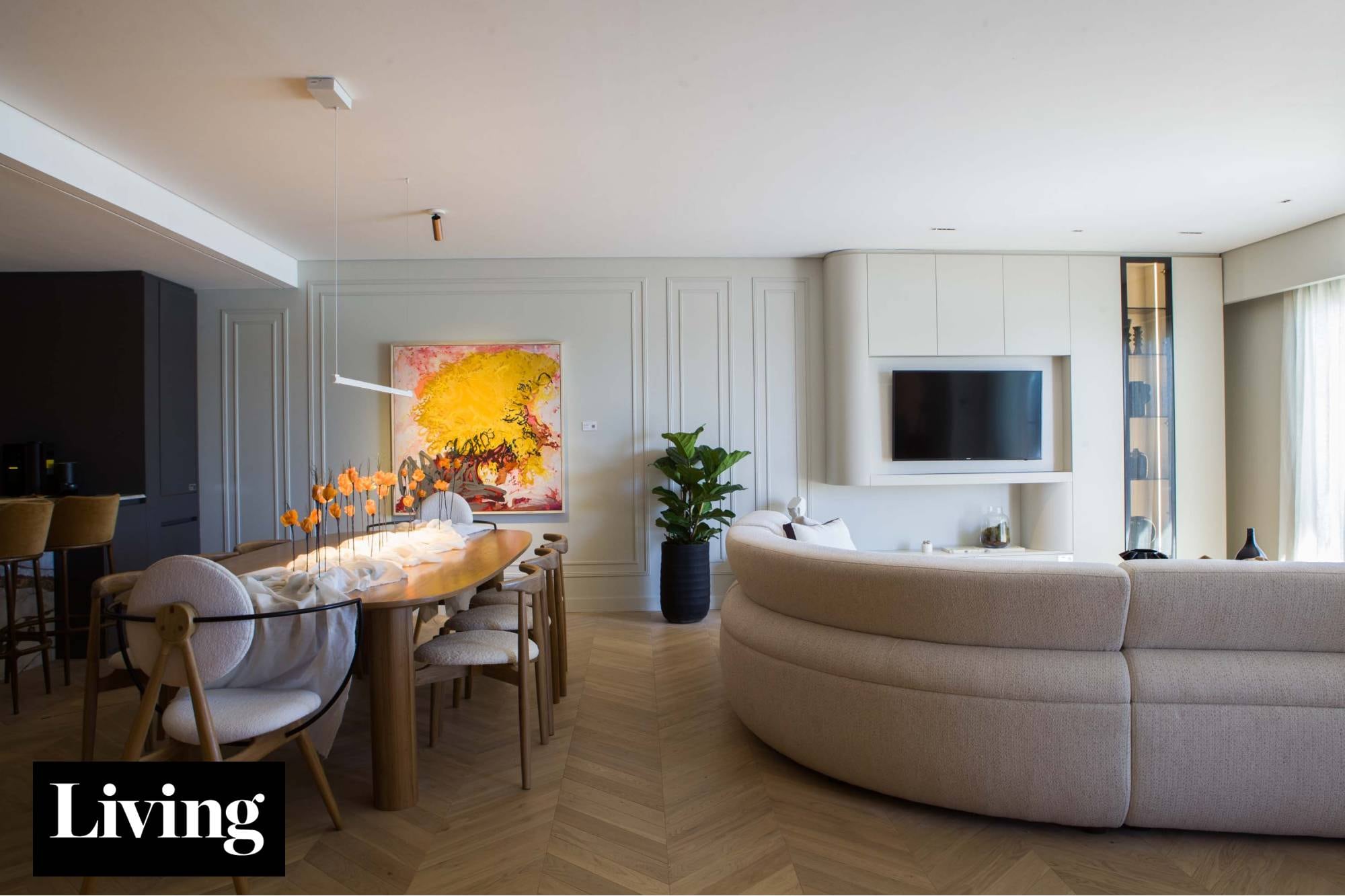 El espacio principal, diseñado para una pareja con gustos atemporales, presenta una decoración de estilo cosmopolita y neoclásico. Este estilo se refuerza con molduras a medida y materiales nobles. Los muebles con curvas, la ausencia de tiradores y una iluminación puntual aportan el toque moderno.