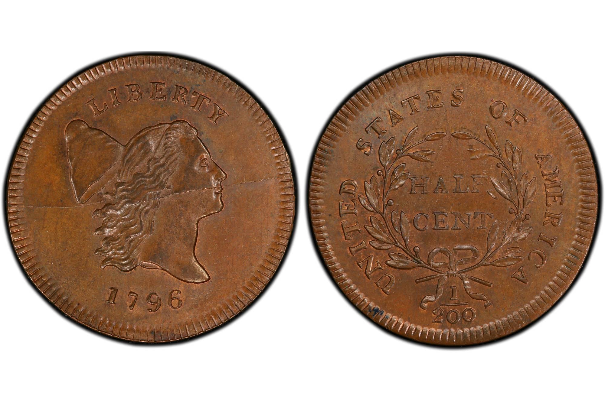 Una moneda de medio centavo de dólar de 1796, conocida como Liberty Cap Right No Pole, alcanza precios superiores al millón de dólares por un error de acuñación y su escasa disponibilidad.